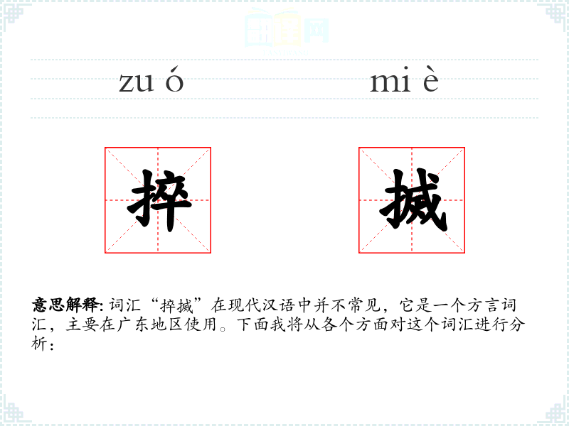 词汇“捽搣”在现代汉语中并不常见,它是一个方言词汇,主要在广东地区使用。下面我将从各个方面对这个词汇进行分析: