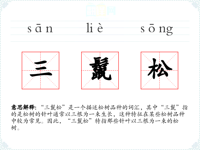 “三鬣松”是一个描述松树品种的词汇,其中“三鬣”指的是松树的针叶通常以三根为一束生长,这种特征在某些松树品种中较为常见。因此,“三鬣松”特指那些针叶以三根为一束的松树。