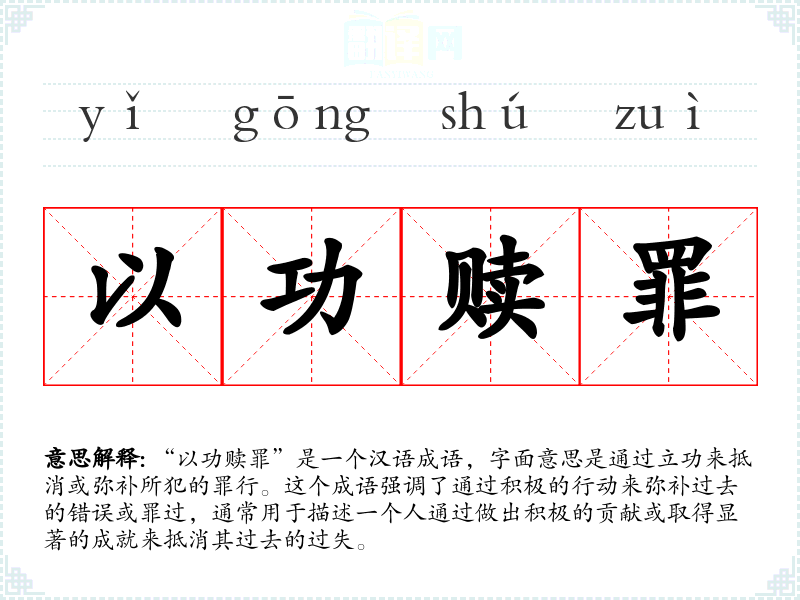 “以功赎罪”是一个汉语成语,字面意思是通过立功来抵消或弥补所犯的罪行。这个成语强调了通过积极的行动来弥补过去的错误或罪过,通常用于描述一个人通过做出积极的贡献或取得显著的成就来抵消其过去的过失。