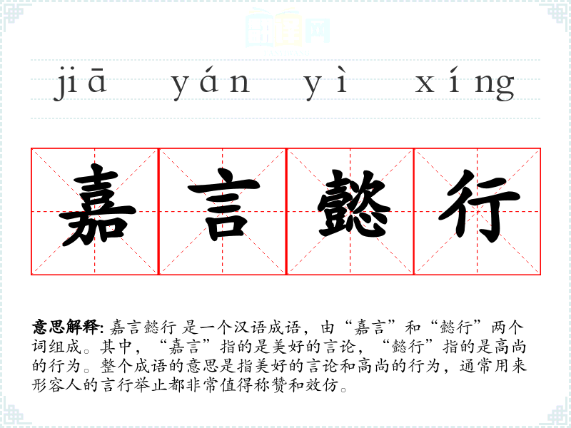 嘉言懿行 是一个汉语成语,由“嘉言”和“懿行”两个词组成。其中,“嘉言”指的是美好的言论,“懿行”指的是高尚的行为。整个成语的意思是指美好的言论和高尚的行为,通常用来形容人的言行举止都非常值得称赞和效仿。