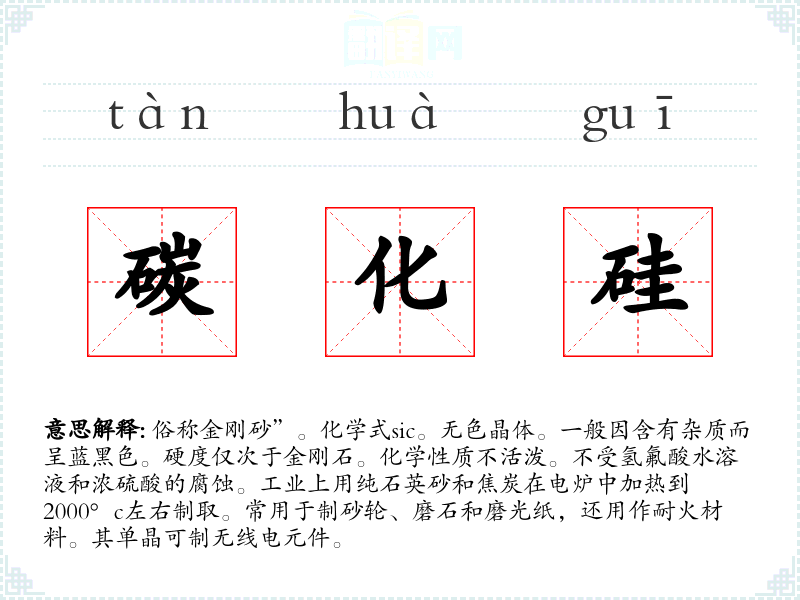 1.俗称金刚砂”。化学式sic。无色晶体。一般因含有杂质而呈蓝黑色。硬度仅次于金刚石。化学性质不活泼。不受氢氟酸水溶液和浓硫酸的腐蚀。工业上用纯石英砂和焦炭在电炉中加热到2000°c左右制取。常用于制砂轮、磨石和磨光纸,还用作耐火材料。其单晶可制无线电元件。
