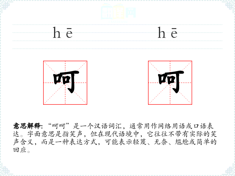 “呵呵”是一个汉语词汇,通常用作网络用语或口语表达。字面意思是指笑声,但在现代语境中,它往往不带有实际的笑声含义,而是一种表达方式,可能表示轻蔑、无奈、尴尬或简单的回应。