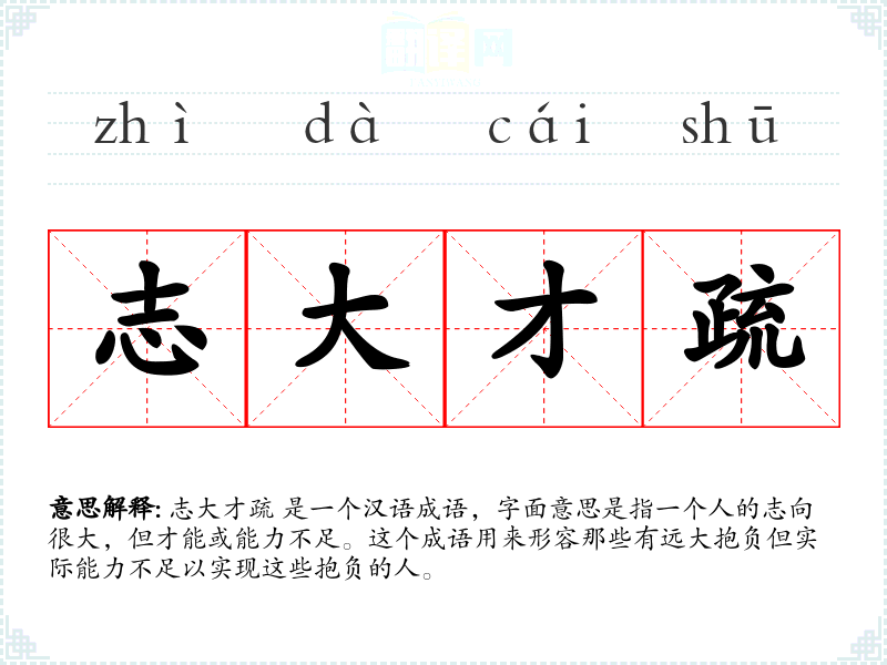 志大才疏 是一个汉语成语,字面意思是指一个人的志向很大,但才能或能力不足。这个成语用来形容那些有远大抱负但实际能力不足以实现这些抱负的人。