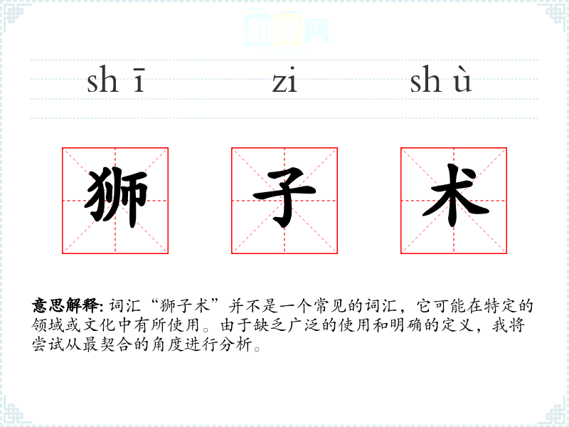 词汇“狮子术”并不是一个常见的词汇,它可能在特定的领域或文化中有所使用。由于缺乏广泛的使用和明确的定义,我将尝试从最契合的角度进行分析。