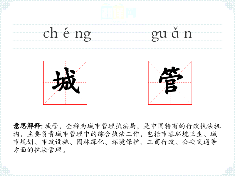 - 反义词:无(城管是一个特定机构,没有直接的反义词)