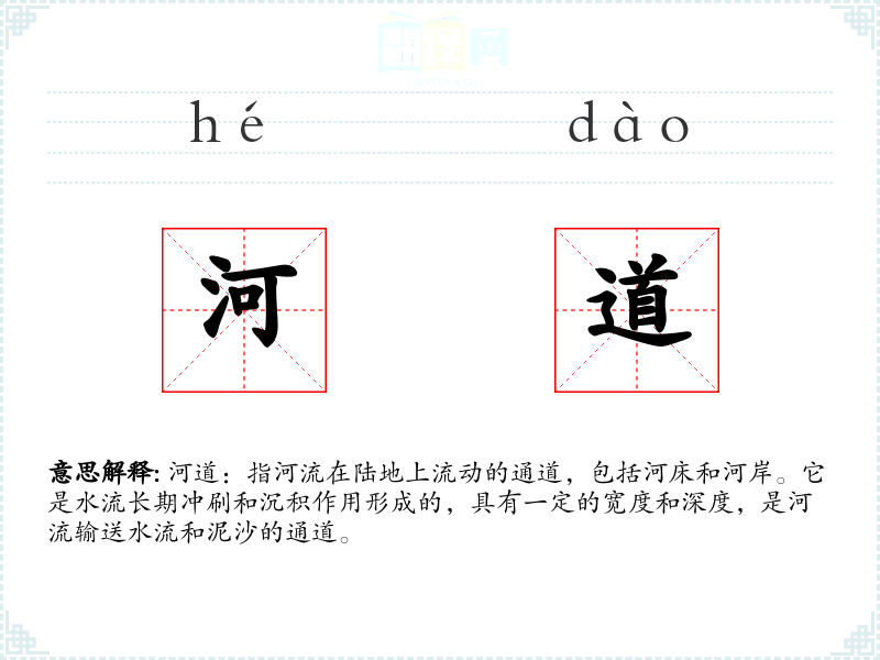 - 反义词:河岸、河滩、河堤