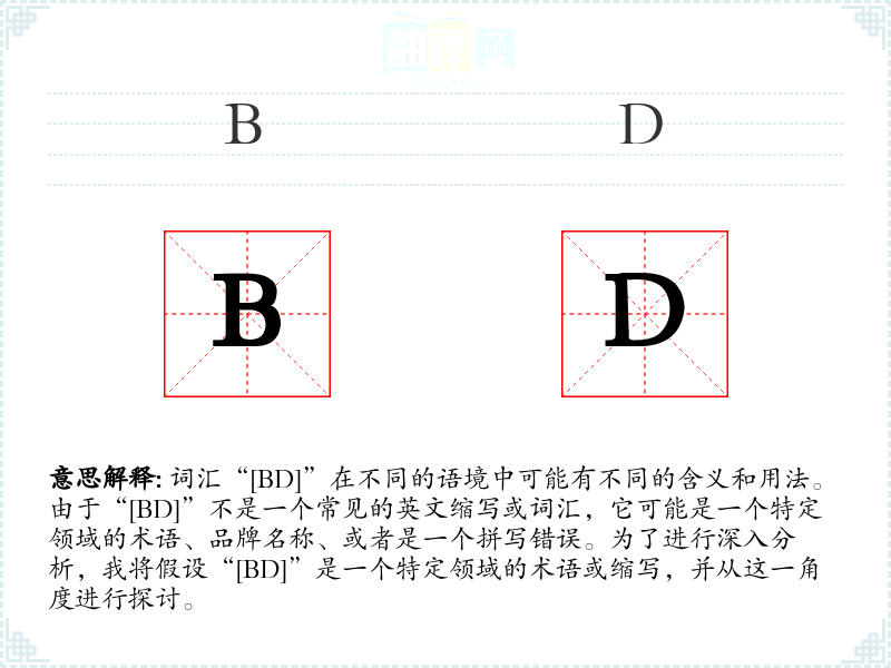 词汇“[BD]”在不同的语境中可能有不同的含义和用法。由于“[BD]”不是一个常见的英文缩写或词汇,它可能是一个特定领域的术语、品牌名称、或者是一个拼写错误。为了进行深入分析,我将假设“[BD]”是一个特定领域的术语或缩写,并从这一角度进行探讨。