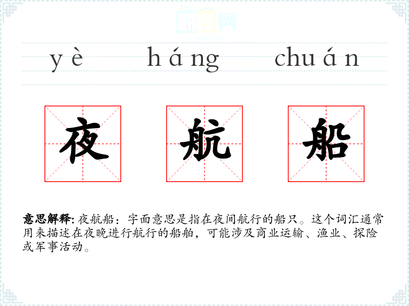 夜航船:字面意思是指在夜间航行的船只。这个词汇通常用来描述在夜晚进行航行的船舶,可能涉及商业运输、渔业、探险或军事活动。