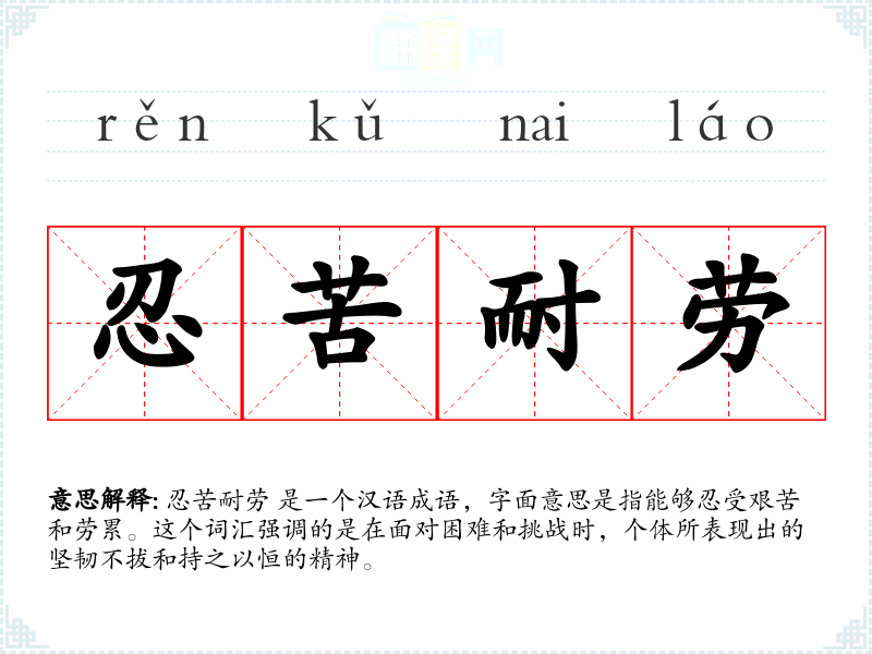 忍苦耐劳 是一个汉语成语,字面意思是指能够忍受艰苦和劳累。这个词汇强调的是在面对困难和挑战时,个体所表现出的坚韧不拔和持之以恒的精神。