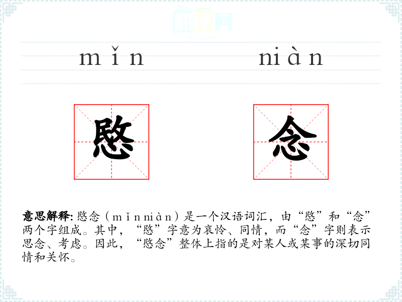 愍念(mǐn niàn)是一个汉语词汇,由“愍”和“念”两个字组成。其中,“愍”字意为哀怜、同情,而“念”字则表示思念、考虑。因此,“愍念”整体上指的是对某人或某事的深切同情和关怀。