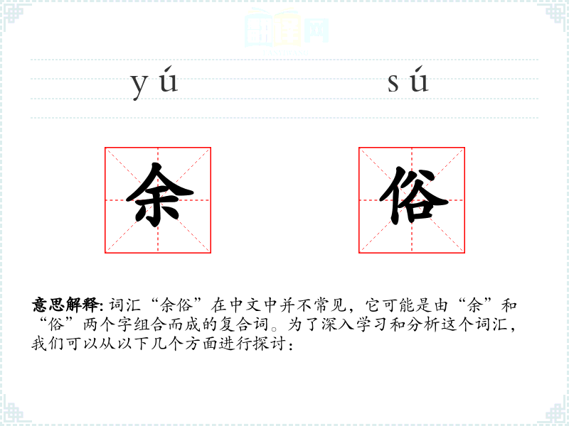词汇“余俗”在中文中并不常见,它可能是由“余”和“俗”两个字组合而成的复合词。为了深入学习和分析这个词汇,我们可以从以下几个方面进行探讨: