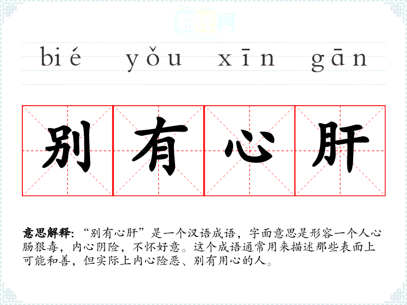 “别有心肝”是一个汉语成语,字面意思是形容一个人心肠狠毒,内心阴险,不怀好意。这个成语通常用来描述那些表面上可能和善,但实际上内心险恶、别有用心的人。