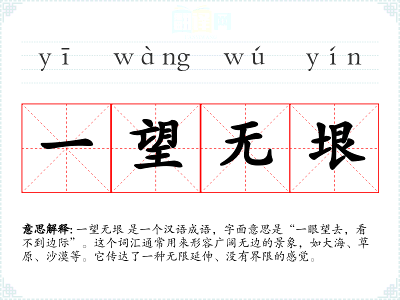 一望无垠 是一个汉语成语,字面意思是“一眼望去,看不到边际”。这个词汇通常用来形容广阔无边的景象,如大海、草原、沙漠等。它传达了一种无限延伸、没有界限的感觉。