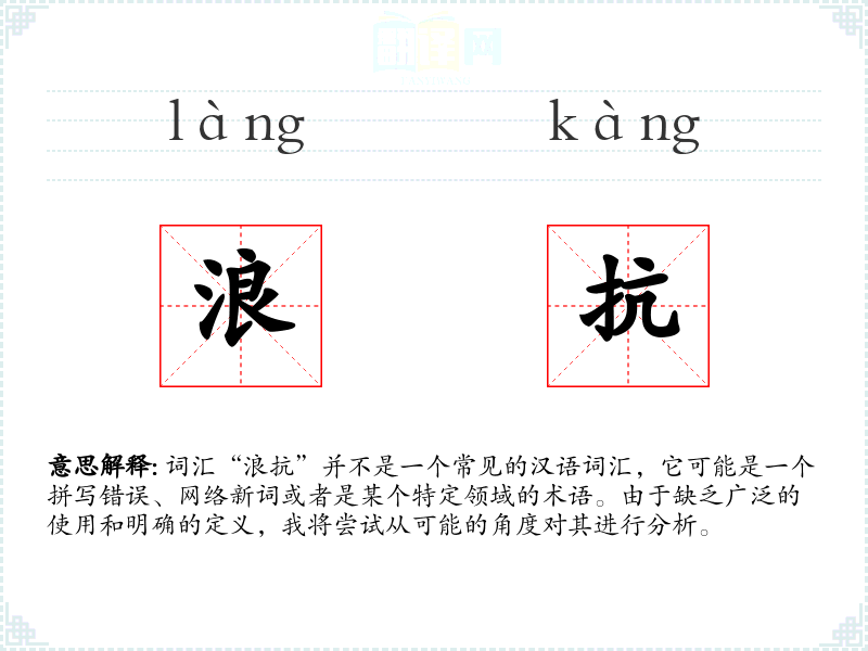 由于“浪抗”不是一个标准词汇,我们无法给出确切的字面意思和基本含义。它可能是由“浪”和“抗”两个字组合而成的新词,其中“浪”通常指波浪或放纵的行为,“抗”则表示抵抗或对抗。