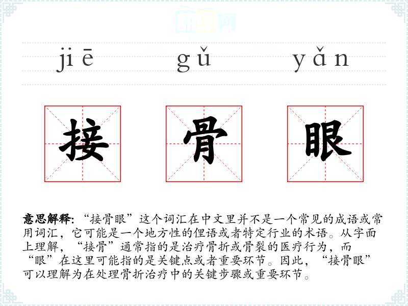在**文化中,骨折治疗一直是一个重要的医疗领域,因此“接骨”作为一个词汇在医学领域有着悠久的历史。而“眼”作为一个比喻,用来形容事物的关键部分,也是中文中常见的表达方式。