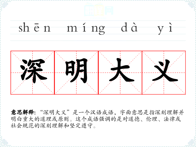 “深明大义”是一个汉语成语,字面意思是指深刻理解并明白重大的道理或原则。这个成语强调的是对道德、伦理、法律或社会规范的深刻理解和坚定遵守。