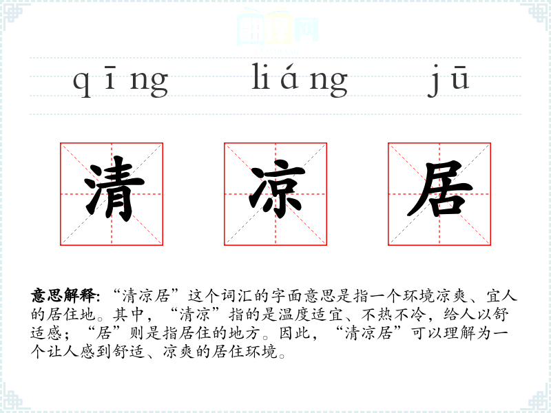 “清凉居”这个词汇的字面意思是指一个环境凉爽、宜人的居住地。其中,“清凉”指的是温度适宜、不热不冷,给人以舒适感;“居”则是指居住的地方。因此,“清凉居”可以理解为一个让人感到舒适、凉爽的居住环境。