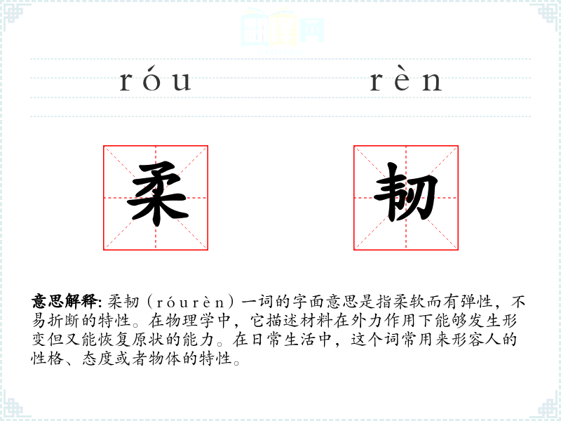 “柔韧”一词源自汉语,由“柔”和“韧”两个字组成。在古代汉语中,“柔”指柔软,“韧”指坚韧。随着时间的推移,这两个字结合在一起,形成了现代汉语中的“柔韧”一词,用来描述既柔软又坚韧的特性。