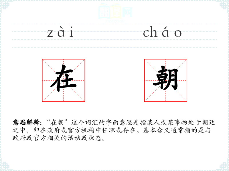 “在朝”这个词汇的字面意思是指某人或某事物处于朝廷之中,即在政府或官方机构中任职或存在。基本含义通常指的是与政府或官方相关的活动或状态。
