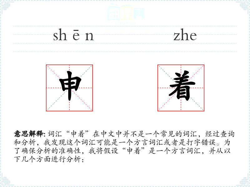 词汇“申着”在中文中并不是一个常见的词汇,经过查询和分析,我发现这个词汇可能是一个方言词汇或者是打字错误。为了确保分析的准确性,我将假设“申着”是一个方言词汇,并从以下几个方面进行分析: