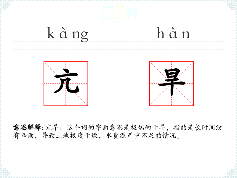 亢旱:这个词的字面意思是极端的干旱,指的是长时间没有降雨,导致土地极度干燥,水资源严重不足的情况。