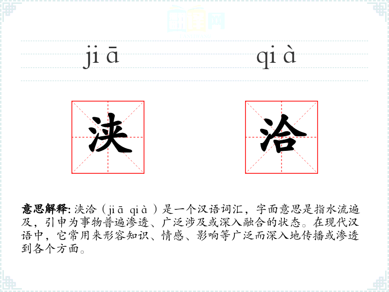 浃洽(jiā qià)是一个汉语词汇,字面意思是指水流遍及,引申为事物普遍渗透、广泛涉及或深入融合的状态。在现代汉语中,它常用来形容知识、情感、影响等广泛而深入地传播或渗透到各个方面。