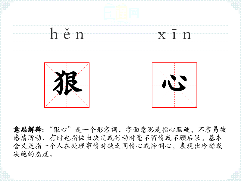 “狠心”是一个形容词,字面意思是指心肠硬,不容易被感情所动,有时也指做出决定或行动时毫不留情或不顾后果。基本含义是指一个人在处理事情时缺乏同情心或怜悯心,表现出冷酷或决绝的态度。