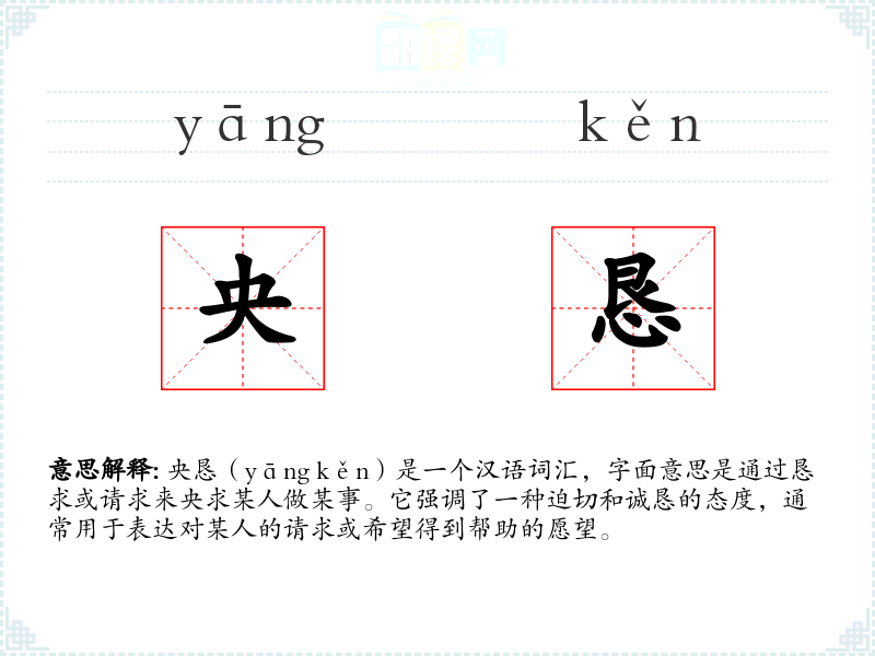 央恳(yāng kěn)是一个汉语词汇,字面意思是通过恳求或请求来央求某人做某事。它强调了一种迫切和诚恳的态度,通常用于表达对某人的请求或希望得到帮助的愿望。