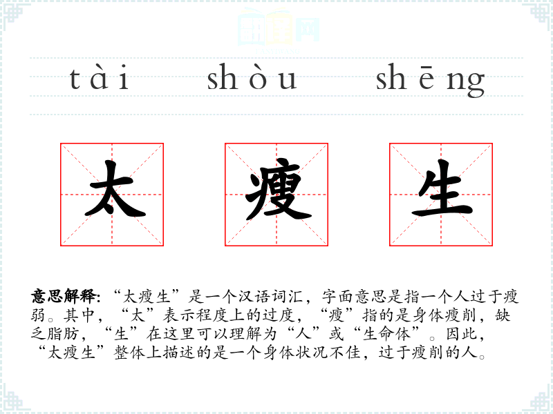 “太瘦生”是一个汉语词汇,字面意思是指一个人过于瘦弱。其中,“太”表示程度上的过度,“瘦”指的是身体瘦削,缺乏脂肪,“生”在这里可以理解为“人”或“生命体”。因此,“太瘦生”整体上描述的是一个身体状况不佳,过于瘦削的人。
