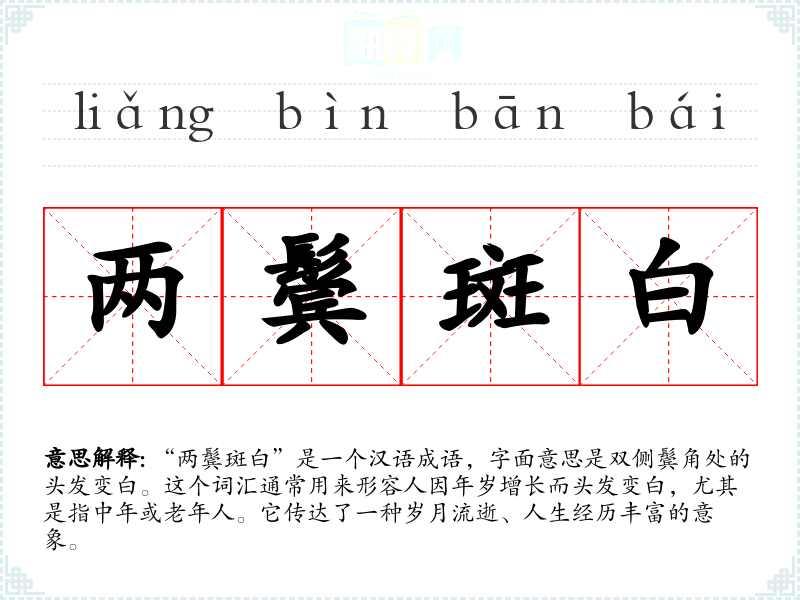 “两鬓斑白”这个词汇源自古代汉语,其中“两鬓”指的是双侧的鬓角,“斑白”则是指颜色斑驳的白。这个词汇随着时间的推移,其基本含义保持不变,但在现代汉语中使用频率可能有所下降。