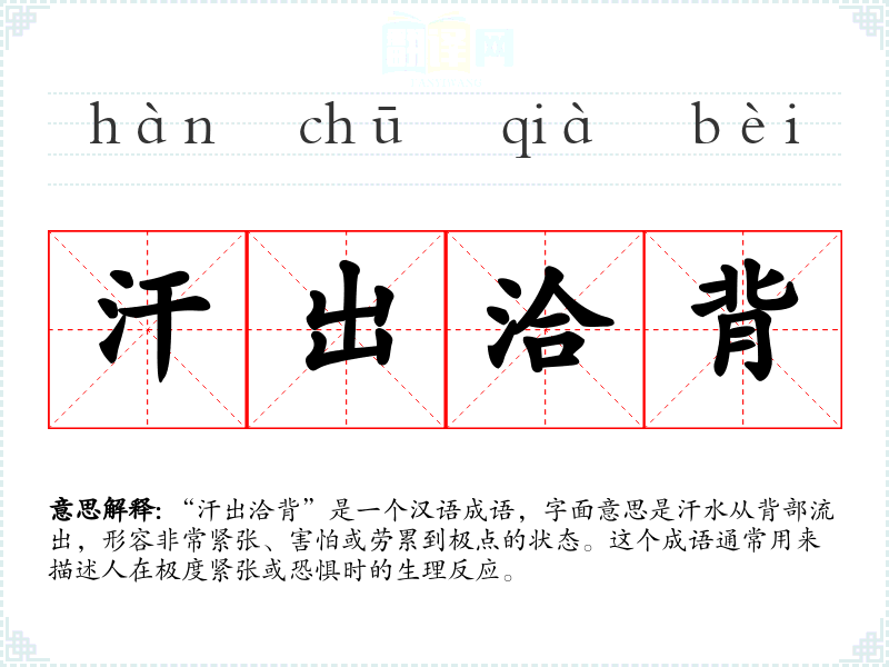 “汗出洽背”这个成语的词源较为古老,可能源自古代对人在极端情绪状态下的生理反应的观察。随着时间的推移,这个成语在汉语中被广泛使用,并保留了其原始的意象和含义。