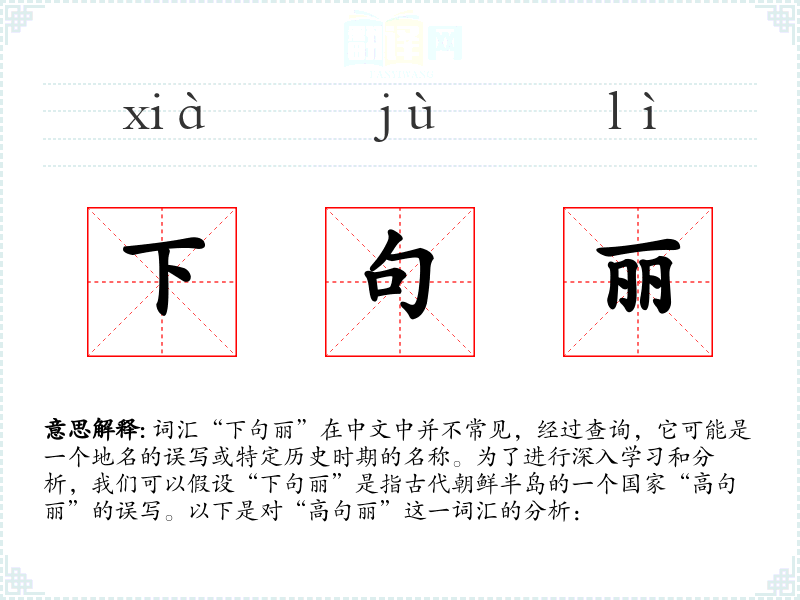 词汇“下句丽”在中文中并不常见,经过查询,它可能是一个地名的误写或特定历史时期的名称。为了进行深入学*和分析,我们可以假设“下句丽”是指古代朝鲜半岛的一个国家“高句丽”的误写。以下是对“高句丽”这一词汇的分析:
