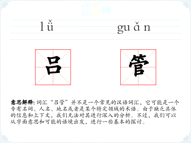 词汇“吕管”并不是一个常见的汉语词汇,它可能是一个专有名词、人名、地名或者是某个特定领域的术语。由于缺乏具体的信息和上下文,我们无法对其进行深入的分析。不过,我们可以从字面意思和可能的语境出发,进行一些基本的探讨。