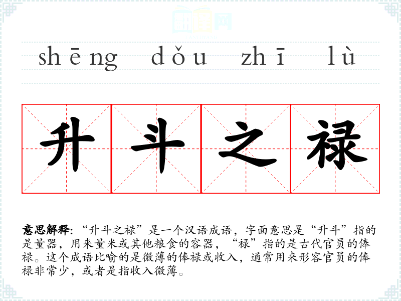 “升斗之禄”是一个汉语成语,字面意思是“升斗”指的是量器,用来量米或其他粮食的容器,“禄”指的是古代官员的俸禄。这个成语比喻的是微的俸禄或收入,通常用来形容官员的俸禄非常少,或者是指收入微。