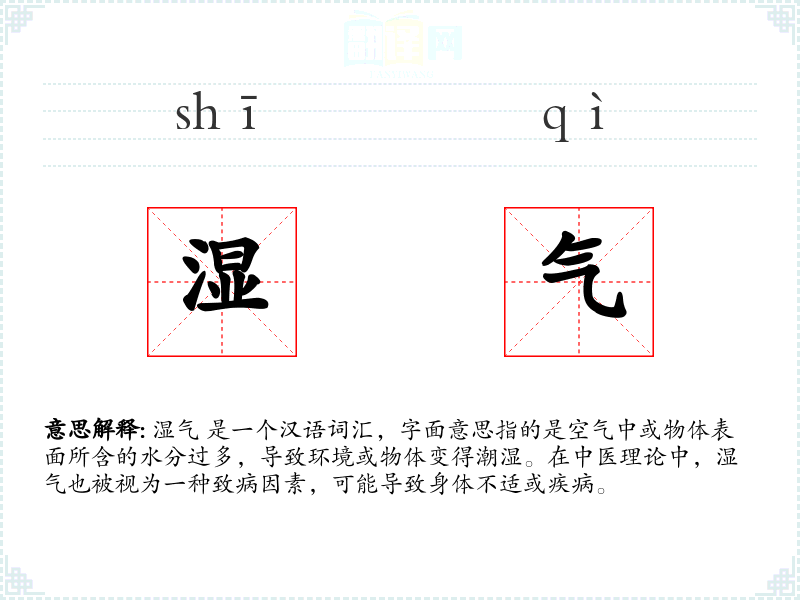 湿气 是一个汉语词汇,字面意思指的是空气中或物体表面所含的水分过多,导致环境或物体变得潮湿。在中医理论中,湿气也被视为一种致病因素,可能导致身体不适或疾病。