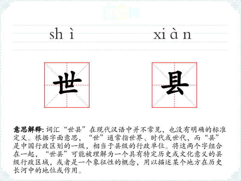 由于“世县”是一个特定于中文的词汇,它在其他语言中可能没有直接对应的词汇。在跨文化交流中,可能需要解释其特定的历史和文化含义。