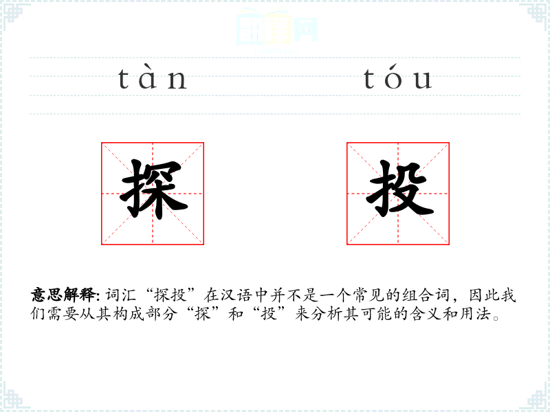 词汇“探投”在汉语中并不是一个常见的组合词,因此我们需要从其构成部分“探”和“投”来分析其可能的含义和用法。