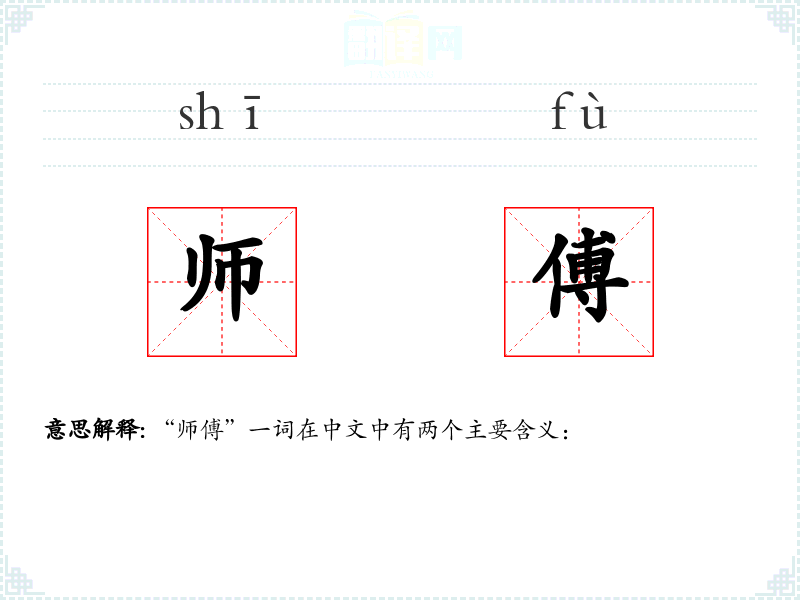 - 指传授技艺或知识的人,通常是某个行业或手艺的专家,如木工师傅、厨师师傅等。