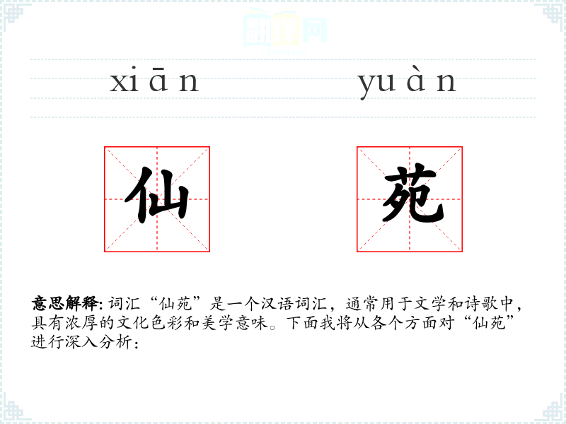 - 文学语境:在文学作品中,“仙苑”常被用来描绘一个理想化的、超凡脱俗的场景,如仙境般的花园,充满了奇花异草和神秘的氛围。