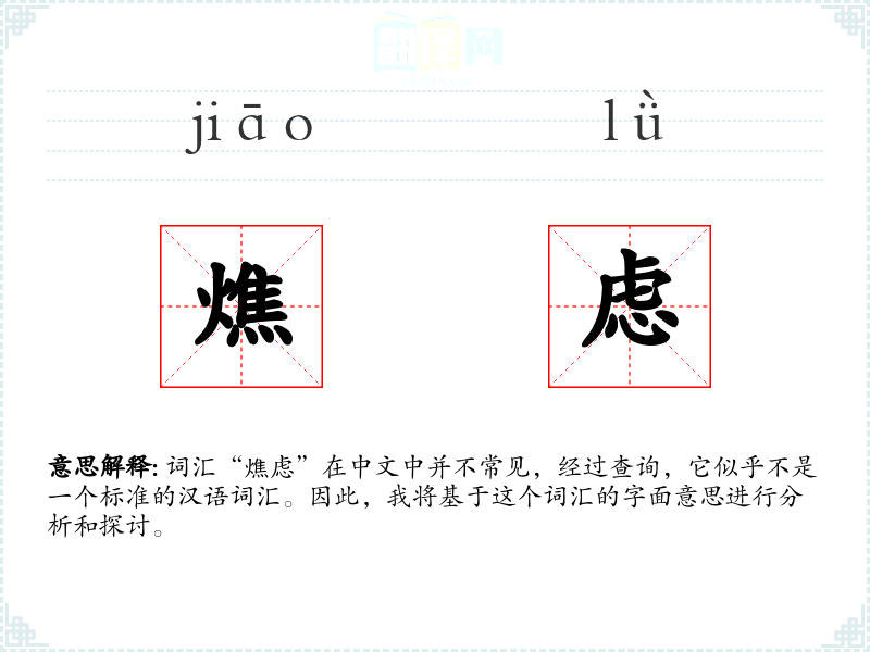 结合这两个字,“燋虑”可以理解为极度焦虑或忧虑的状态,类似于“焦急忧虑”。