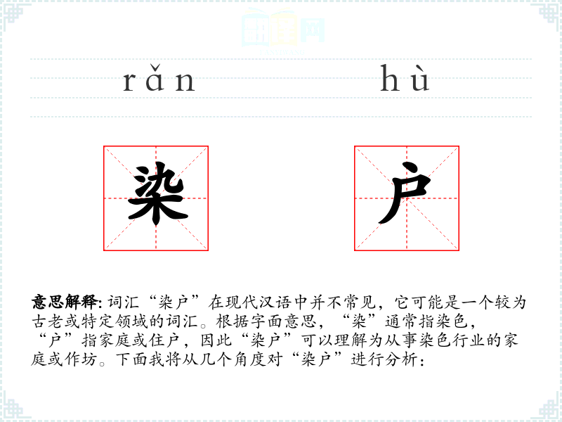 - 文学语境:在古代文学作品中,染户可能被提及作为社会经济活动的一部分,如《红楼梦》中提到的“染坊”。