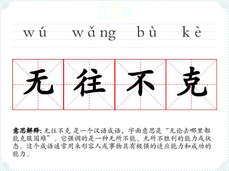 无往不克 是一个汉语成语,字面意思是“无论去哪里都能克服困难”。它强调的是一种无所不能、无所不胜利的能力或状态。这个成语通常用来形容人或事物具有极强的适应能力和成功的能力。