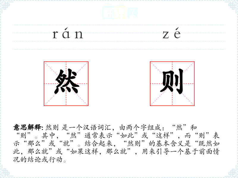 然则 是一个汉语词汇,由两个字组成:“然”和“则”。其中,“然”通常表示“如此”或“这样”,而“则”表示“那么”或“就”。结合起来,“然则”的基本含义是“既然如此,那么就”或“如果这样,那么就”,用来引导一个基于前面情况的结论或行动。