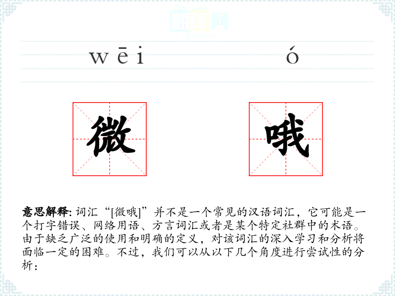 由于“[微哦]”不是一个标准词汇,我们无法给出确切的字面意思和基本含义。它可能是由“微”和“哦”两个字组合而成的,其中“微”可能表示轻微、微小,而“哦”则是一个表示了解或回应的语气词。