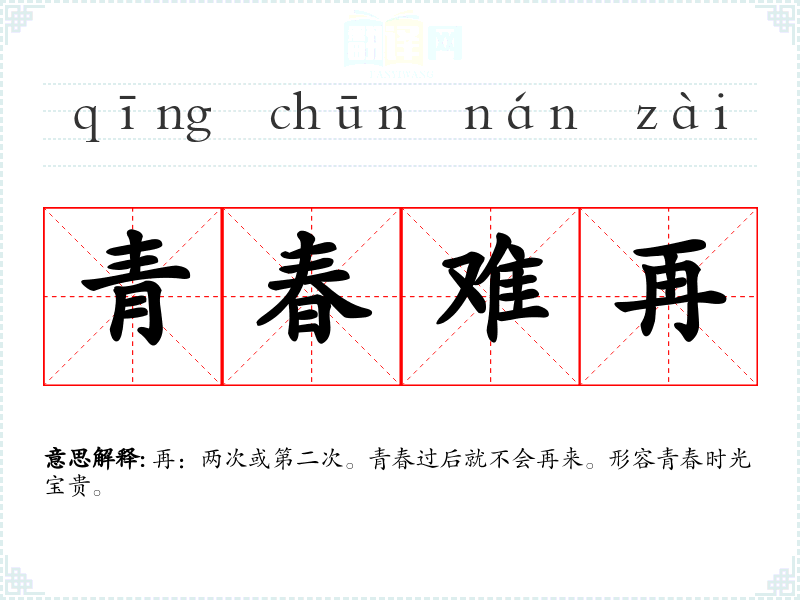 再:两次或第二次。青春过后就不会再来。形容青春时光宝贵。