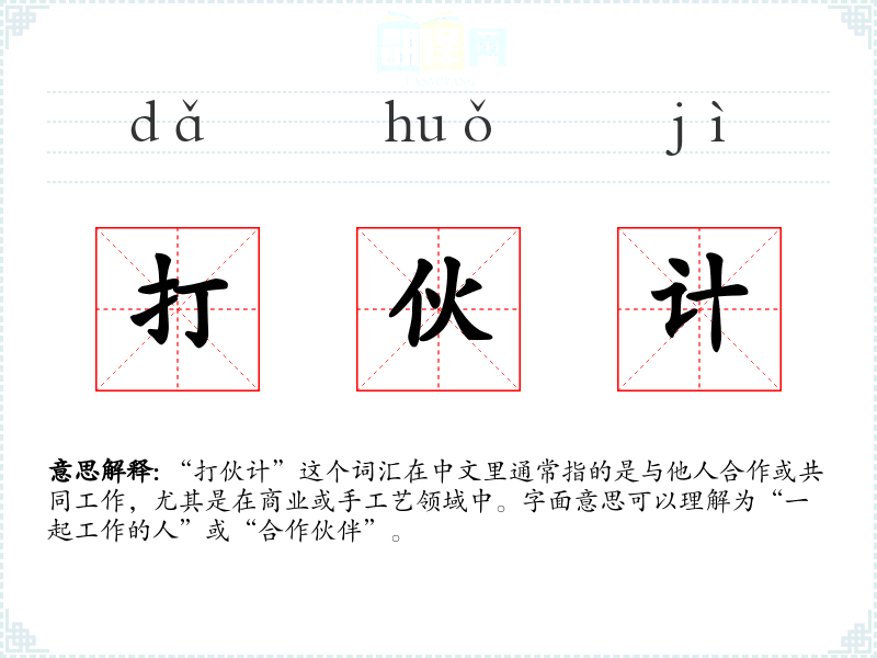 “打伙计”这个词汇在中文里通常指的是与他人合作或共同工作,尤其是在商业或手工艺领域中。字面意思可以理解为“一起工作的人”或“合作伙伴”。