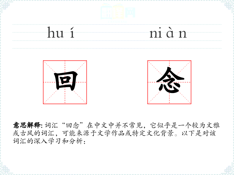 词汇“回念”在中文中并不常见,它似乎是一个较为文雅或古风的词汇,可能来源于文学作品或特定文化背景。以下是对该词汇的深入学*和分析: