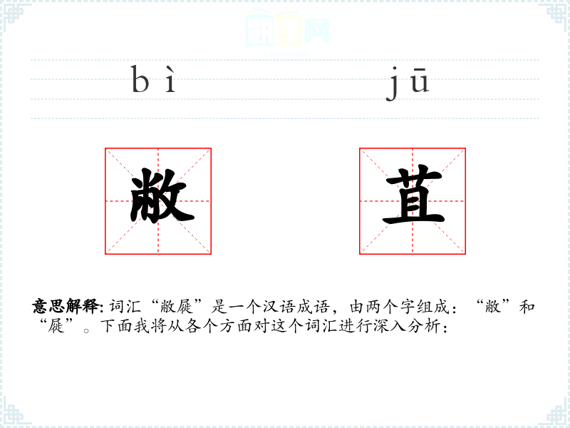 词汇“敝屣”是一个汉语成语,由两个字组成:“敝”和“屣”。下面我将从各个方面对这个词汇进行深入分析: