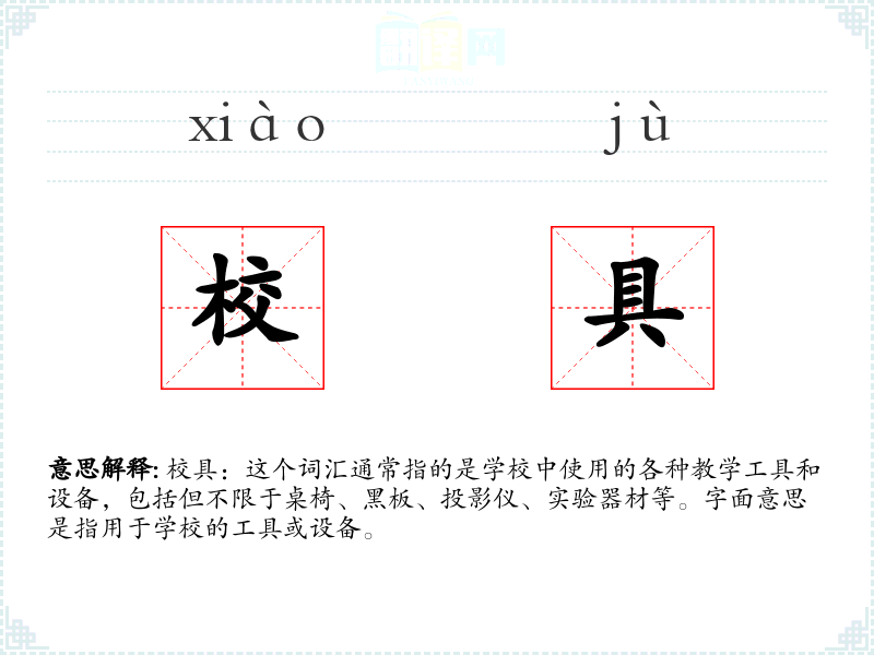 校具:这个词汇通常指的是学校中使用的各种教学工具和设备,包括但不限于桌椅、黑板、投影仪、实验器材等。字面意思是指用于学校的工具或设备。