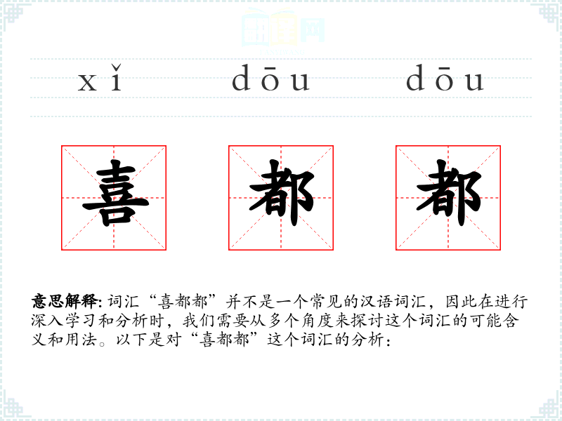词汇“喜都都”并不是一个常见的汉语词汇,因此在进行深入学习和分析时,我们需要从多个角度来探讨这个词汇的可能含义和用法。以下是对“喜都都”这个词汇的分析:
